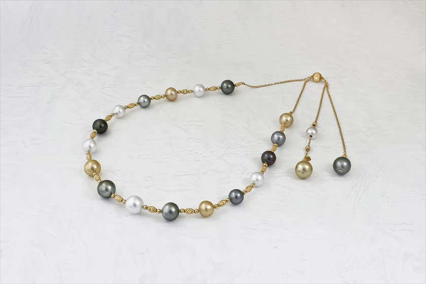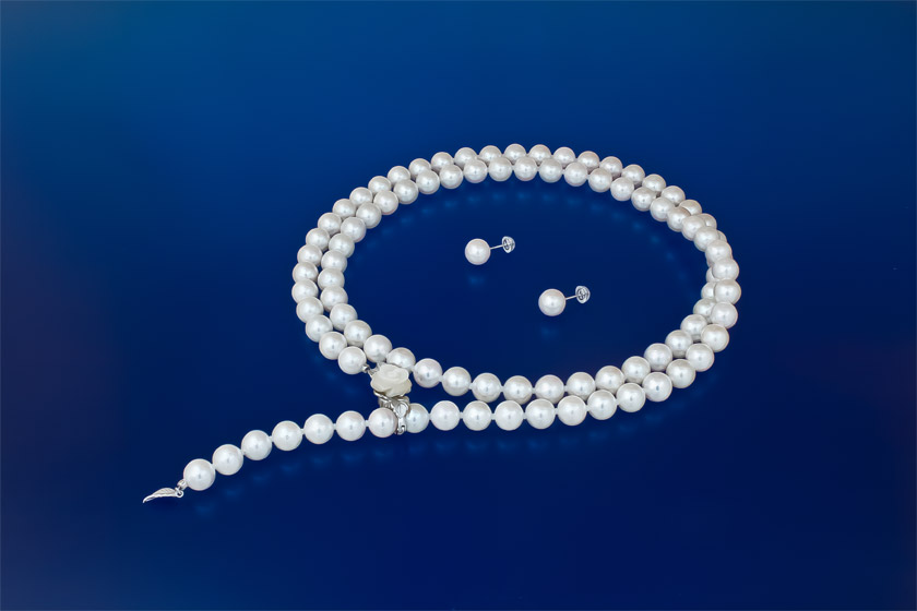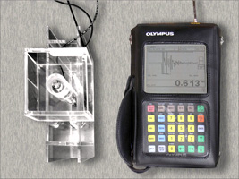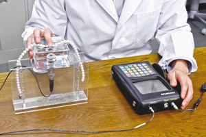 水中で真珠に超音波を発し、真珠表面から核までの反射速度から、真珠層の厚さを測定。宝石鑑定士が波形・数値を読み取り、巻厚を測定します。