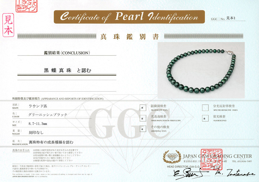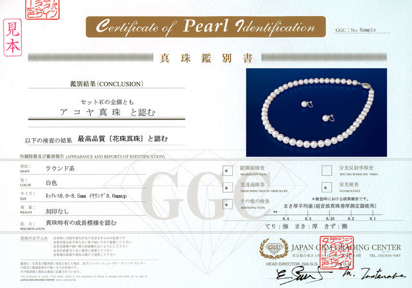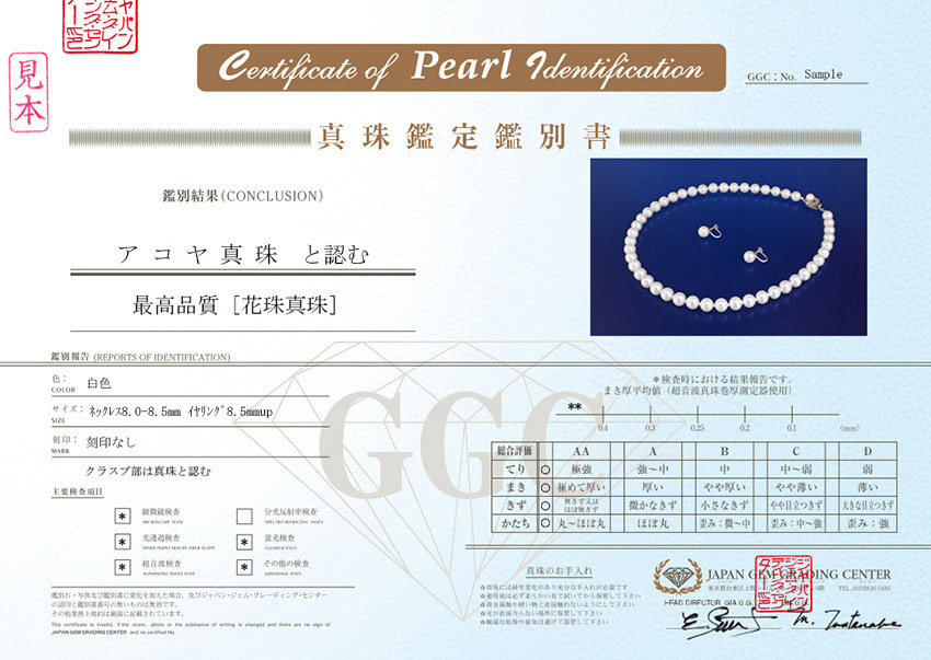 当鑑別機関では、光を透かして内部を確認する「光透過検査」(穴のある珠に対応)と、非破壊で厚さを測る「超音波真珠巻厚測定装置」による2種類の検査があり、結果をスケールの数値欄に記載します。弊社合格基準は連平均値0.35mm以上です。まき厚の評価基準は鑑別機関により異なります。